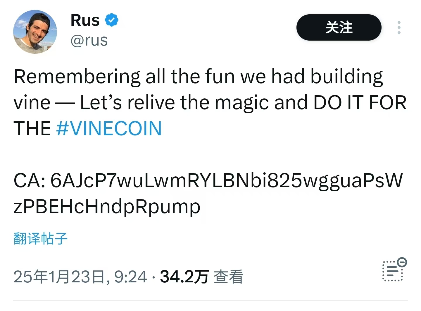 非小号 消息,1 月 23 日,短视频平台 Vine 创始人之一 Rus Yusupov 于 X 平台发布信息表示,已于 pump.fun 发行 VINECOIN,并发布视频证实其账号并未被盗用。