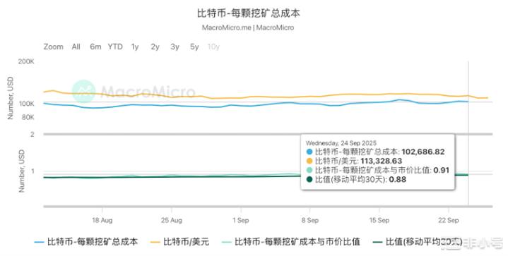 從成本視角,MacroMicro 估算 9/24 比特幣生產成本約 $102,686.82,現貨約 $113,328.63,成本/價格比為 0.91,約 9% 毛利。本週毛利略為壓縮;整體仍有利可圖,但若價格下行,弱勢礦工壓力上升,可能帶來算力波動或遷移至低成本地區。