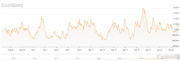 圖表顯示自 ATH 回落至較低帶(約 1.0–1.2 ZH/s)。9/20–9/26 期間未有難度重定:CoinWarz/YCharts 顯示難度自 9/18 調整後維持約 142.34T。日度波動更多來自礦工開停機與礦池隨機性,而非協議變更