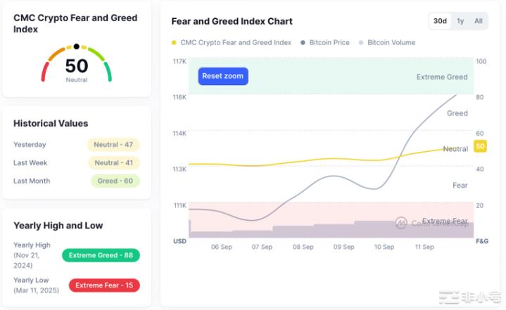 9/20–9/26 日度讀數:48、48、47、40、39、41,區間 32–48。情緒隨價波動而顯著起伏。