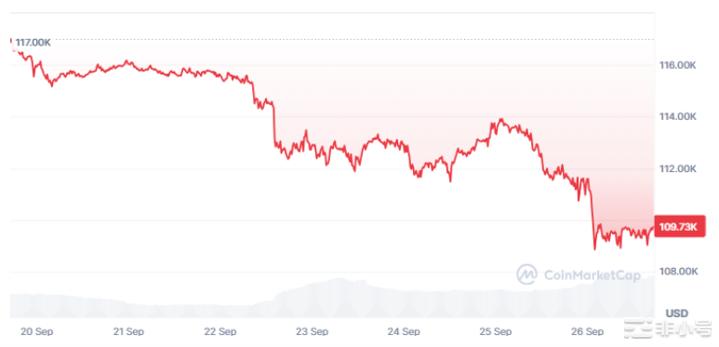 比特幣本週走出「高位盤整 → 區間下破 → ETF 帶動反彈 → 急挫回落 → 低位企穩」的節奏。週內高點為 116,138.4 美元(9 月 20 日),低點為 108,675.3 美元(9 月 25 日),波動約 6.4%。9 月 26 日收於 109,681.3 美元,較 9 月 20 日收盤 115,699.2 美元下跌約 5.2%。附圖清晰呈現此過程:起初在 115–116k 附近穩定,隨後台階式下探至 112k,短暫反彈後出現「空窗式」急跌,最終於 109k 一帶整理。