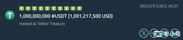 9/20,Whale Alert 追蹤到 Tether 在以太坊增發 10 億 USDT;過去 8 日累計增發 50 億,短線有助於流動性與情緒。