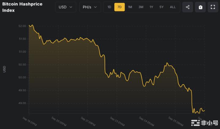 整體趨勢下行,受 BTC 波動、算力變化與費用走弱影響。Hashrate Index 顯示 9/26 Hashprice = $48.71/PH/s/日,週內低點 $48.60(9/26)。