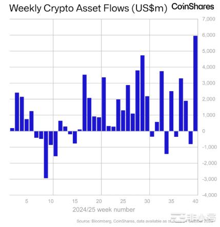 CoinShares:加密基金周度净流入创纪录 $5.96B