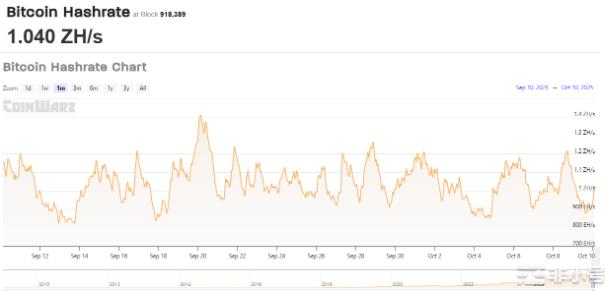 本周比特币网络算力在 CoinWarz 的 1 个月图上于明晰的区间内波动,期末附近的头部估计值为 1.040 ZH/s(区块 918,389)。过去 7 天,图上读数总体在高 900 EH/s 区间与低至中 1.1–1.2 ZH/s 区间之间运行(1 ZH/s = 1,000 EH/s)。其模式更像快速的盘中摆动,而非单边趋势,符合矿工削峰填谷、临时维护与地区电网动态在短时段改变可用电力、进而影响矿场开关机的特征。