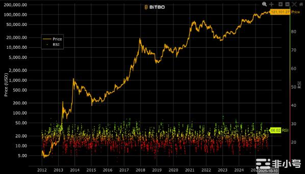 据 Bitbo 数据,截至 10 月 10 日,比特币 14 日 RSI 为 66.02,处于轻度超买边缘。RSI 介于 60–70 通常反映强势上行动能,但若持续高于 70,可能预示短期回撤风险上升。