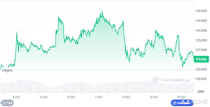 本周比特币处于宽幅但可控的区间内运行,10 月 6 日触及 $126,198.07 的历史新高后回落,至 10 月 10 日约 $121,048。较周一峰值回落约 4.08%,整体围绕 $120k–$126k 区间震荡。市值约 $2.41 兆美元,最近 24 小时交易区间为 $119,812–$123,739,显示周末前多空双方仍在积极博弈。