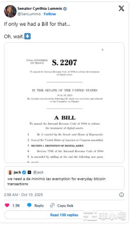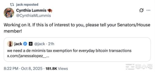 2025 年 10 月 9 日,政策倡议者放大 Lummis 的呼吁,即对小额 BTC 消费免税以常态化日常支付。