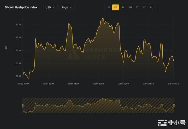 10 月 4 日至 5 日期间,hashprice 多数时间在 ~$51.3 与 ~$51.8 之间震荡,随后在 10 月 5 日晚短暂拉升至 $52.5 每 PH/s-日上方后回落。此类短促的上冲往往来自更强的现货与/或瞬时走高的手续费,从而抬升矿工以美元计的实际收入。即便是从 $51.5 到 $52.5 的一小时级别跳升,也为每 PH/s 每日多带来约 $100 的收入,规模化后影响可观。