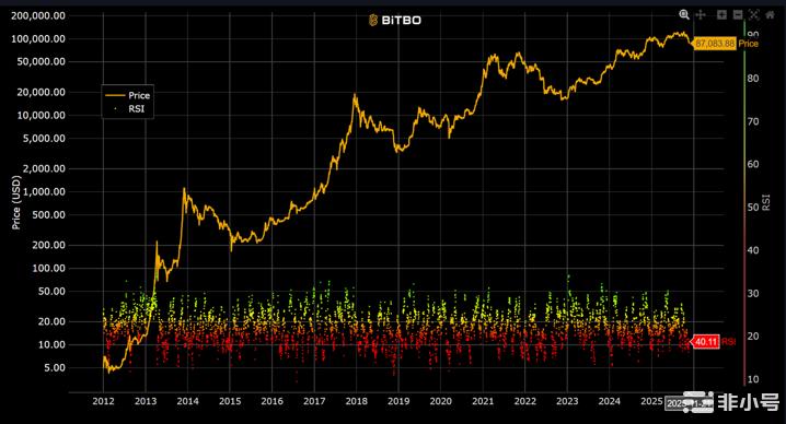 截至本周期末,比特币 14 日 RSI 为 40.11,未触及超卖(RSI<30),较前几日有所回升,但仍处明显弱势区间内。RSI 持续位于 30–45 区间说明市场仍偏弱, 短线超卖压力有所释放,但反弹动能暂不足。