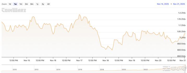 从趋势上看,全网算力仍维持在高位,波动频率高但幅度有限,整体呈现偏强态势。受北美矿区电力供应趋稳影响,多家矿企的算力陆续恢复上线,使全网算力始终保持强劲支撑。本周算力的主要波动仍与币价走势保持同步:在 11 月 18 日比特币价格阶段性回调时,全网算力随之出现短暂下探,最低约落至 905.54EH/s;随后伴随价格快速反弹,算力也同步回升并在周末逼近阶段高点。在高难度、高能耗持续叠加的背景下,矿工利润受到挤压,使算力在高位区域内出现短期调整,但整体趋势仍表现稳健。
