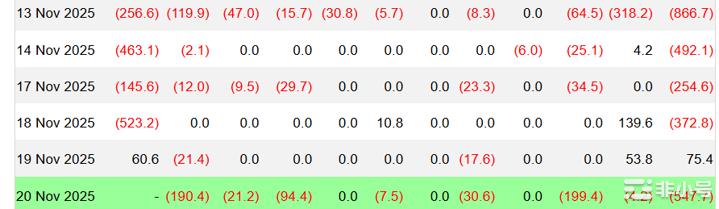 本周期内 ETF 呈现「大规模流出 → 短暂流入 → 再次流出」的结构性弱势。上周四11月13日最终比特币ETF资金流出达到8.667亿美元,为本月迄今最大单日流出。11月14日至18日资金流出较13日收窄,但资金撤离趋势未止。19日流入少量0.754亿美元反弹,此次反弹由贝莱德的IBIT领衔,带来了6060万美元。然而,这一回弹仍未能弥补该基金前一天损失的超5亿美元。20日再次大幅流出5.477亿美元。