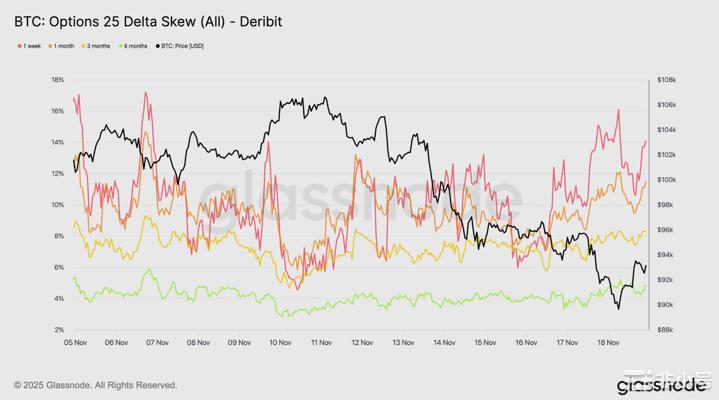比特币短暂跌破九万美元后,期权市场立即重新定价风险,所有期限的隐含波动率明显上升,短端涨幅最为突出。这反映了两大动力:其一,市场对下行保护需求激增;其二,大量短伽马仓位被迫回补并向上滚动,使短期限波动率被动推高。目前的隐含波动率水平已接近十月十日清算事件时的高点,显示交易者快速提升对短期风险的评估。25-delta 偏斜在全部期限都保持负值,一周期限更接近极端看空水平,一周期看跌期权的溢价约为14%,表明市场愿意显著提高下行保护成本。这类买盘会导致做市商空 delta,对冲时进一步卖出期货或永续合约,可能形成自我强化的下压效应。中长期偏斜虽同样偏空但不及短端,六个月期限约略低于5%,显示压力主要集中在短期窗口。