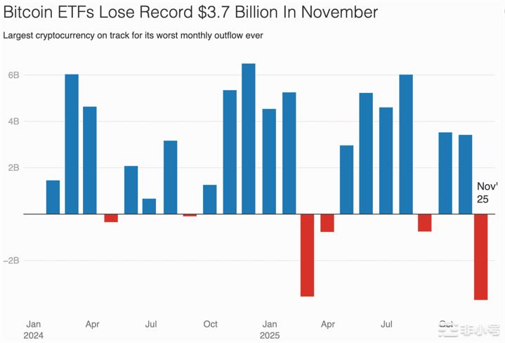 11月26日消息,据福布斯报道,比特币现货 ETF 延续大规模赎回趋势,单月累计净流出已达 37 亿美元,刷新今年 2 月的纪录。受此影响,比特币自 10 月历史高位 12.6 万美元回调超 35%,期间最低触及 8 万美元,为 4 月以来低点。