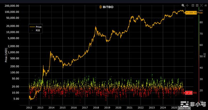 截至本周期末,比特币 14 日 RSI 为 37.33,未触及超卖(RSI<30),较上周40略有下降,但仍处明显弱势区间内。RSI 持续位于 30–45 区间说明市场仍偏弱, 短线超卖压力有所释放,但反弹动能暂不足。