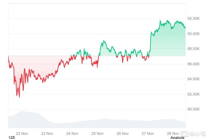 27 日走势出现显著加速,价格由 $88,000 附近快速拉升,成功突破多日无法站稳的 $90,000 阻力位。突破后动能明显增强,最高触及 $91,500–$92,000 区间,这是自本轮大跌以来首次出现“明显突破 + 高位承接”的强势结构。