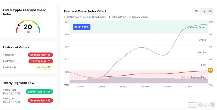 截至11月28日,「恐惧与贪婪指数」约为20点,处于“极度恐惧”区间。