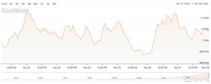从趋势上看,比特币全网算力始终维持在 1 ZH/s 附近的高位区间,整体结构保持强势。虽然短周期内波动频繁,但均属于 高位震荡,并未出现趋势性下滑,显示算力底盘依旧稳固。本周的主要变化依旧与 比特币价格联动明显。11 月 25 日附近 BTC 出现阶段性回调 时,算力同步出现一次急促回落,最低触及 约 877 EH/s。随后随着价格快速修复,算力同样迅速反弹,并在 11 月 27–28 日逼近 1.15 ZH/s 的阶段高点,体现出矿业内的算力恢复速度和高成本环境下的韧性。
