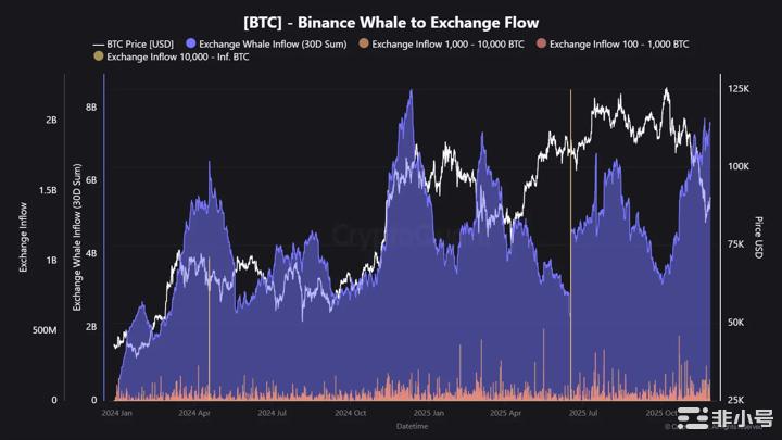 CryptoQuant 数据显示,过去 30 天内,流入币安的 BTC 巨鲸资金规模已达到 75 亿美元,为一年新高。该资金流入结构与过去高波动行情高度一致,通常意味着: