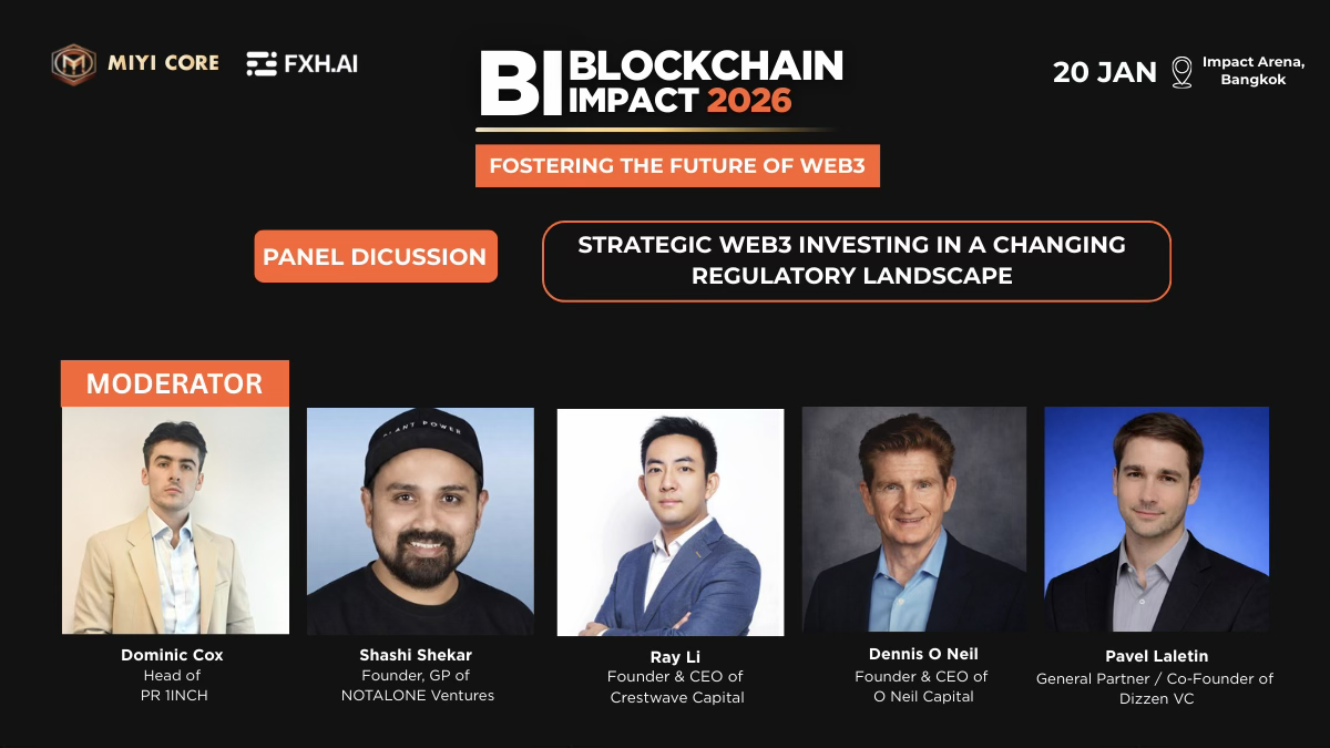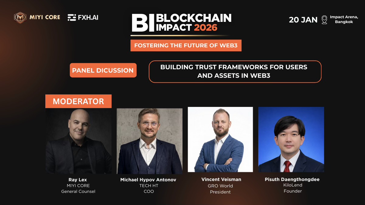 参与讨论的嘉宾包括 MIYI Core General Counsel Ray Lex、TECH HT COO Michael Hypov Antonov、GRO World President Vincent Veisman 以及 KiloLend 创始人 Pisuth Daengthongdee。